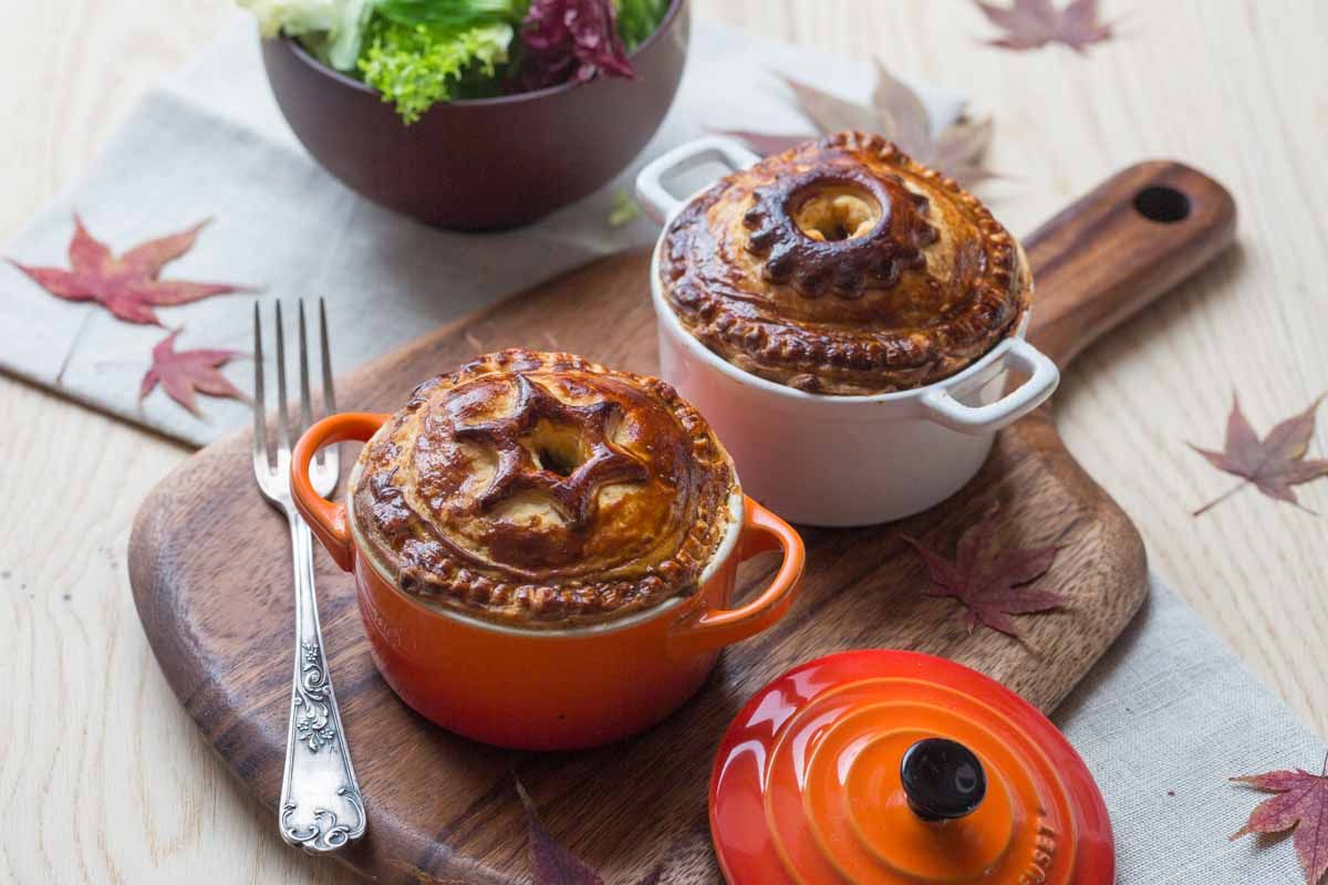 - Découpez 4 disques de pâte feuilletée pour couvrir les pâtés et soudez bien les bords. N'oubliez pas de faire une petite ouverture pour la vapeur.