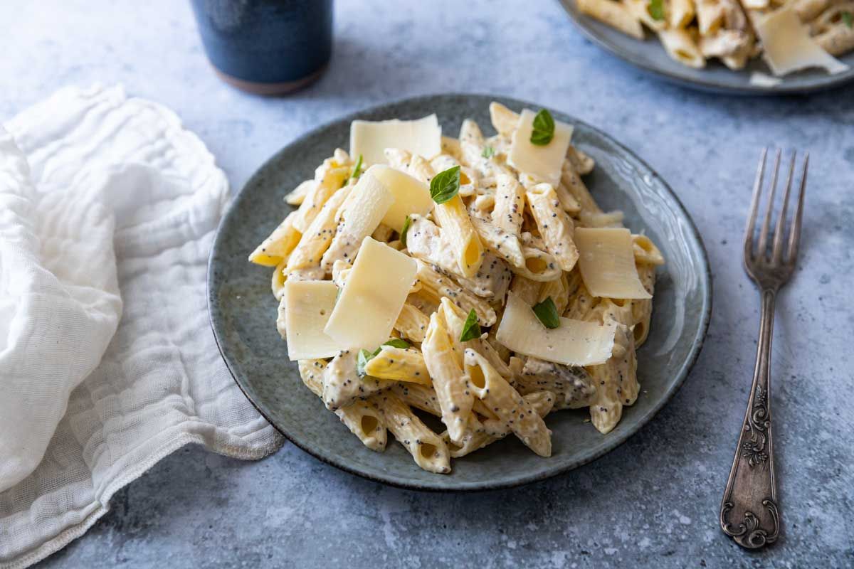 Dans un autre récipient, préparez la sauce : mélangez la mayonnaise, les graines de pavot et le jus de citron. Incorporez-y les pâtes refroidies, les dés de poulet rôti, les pignons de pin, et le basilic finement haché.