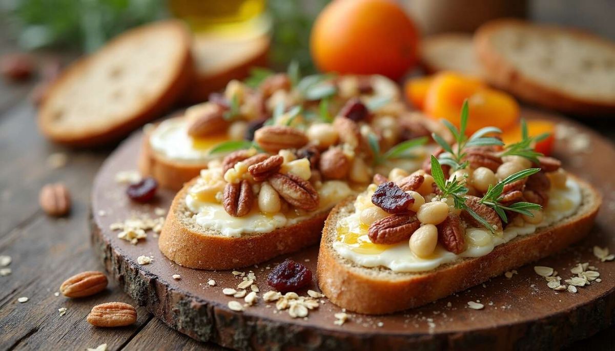 Sur chaque tranche, ajoutez un mélange de noix et de flocons d’avoine, puis quelques fruits secs pour apporter une note sucrée.
