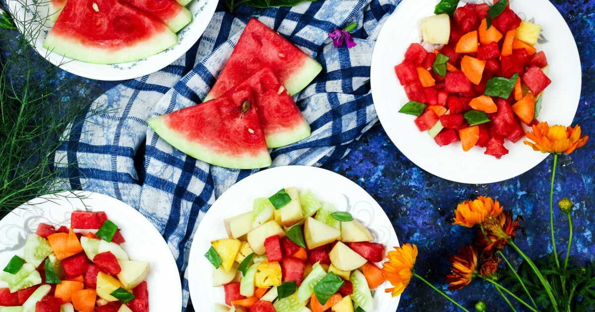 La recette se compose notamment de melons, pastèques, avocats, tomates cerises, mozzarella, quinoa, menthe, basilic, citron vert, huile d'olive et fleur de sel.