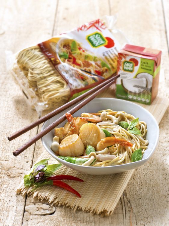 - Dans un wok ou une grande poêle, faites chauffer un peu d'huile d'olive. Faites-y dorer les noix de Saint-Jacques, puis ajoutez les crevettes et réservez.