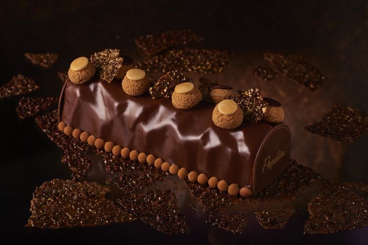 Inspirée par l'Art déco, cette bûche propose une harmonie de marron et de chocolat. Prix: 95 €