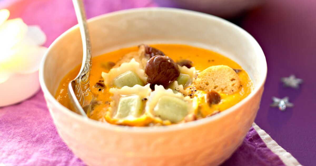 Servez le velouté chaud, garni de quelques ravioles et d'une touche de crème si désiré. Ce plat réconfortant est parfait pour vos repas familiaux ou vos dîners entre amis durant les soirées d'hiver.