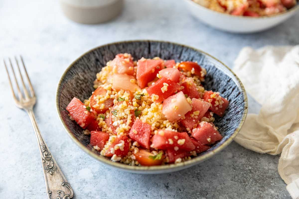 - Mélangez le boulgour avec la pastèque, les tomates cerise, la feta et la vinaigrette. Servez bien frais.